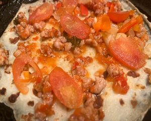 6. Для сборки блинного пирога блин уложить в огнеупорную форму, распределить начинку, кружочки помидора