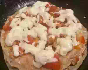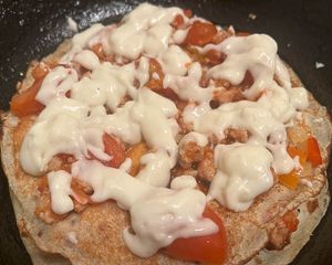 8. Следующий слой - блин с начинкой, но без соуса, добавить кусочки моцареллы.