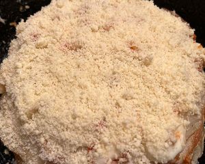 10. Последний слой смазать соусом и посыпать тертым сыром. Форму с блинным пирогом отправить в разогретую до 180С духовку на 10 минут. Блинный пирог с мясным фаршем, сыром моцарелла и соусом бешамель готов к подаче.