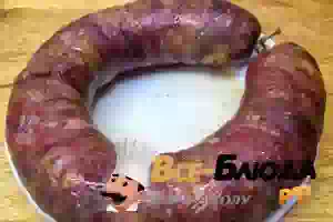 3. С помощью насадки, наполняем кишки или другую оболочку фаршем и закрепляем колбаску с обоих концов нитками. Протыкаем иглой колбасу в нескольких местах, чтобы при варке не лопнула оболочка.