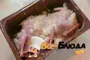 4. Уложить тушки перепелов в миску подходящего размера или пищевой контейнер, перекладывая кашицей из лука и чеснока, посыпая солью и перцем по вкусу. Хорошо перемешать, чтобы мясо было покрыто луковой массой со всех сторон.