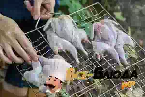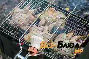 6. В мангале прожечь дрова до «седых» углей. Решету смазать растительным маслом, уложить тушки перепелов, раскладывая их, как показано на фото. Не забудьте стряхнуть с них весь лук.