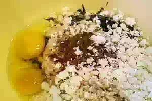 2. Добавить все остальные перечисленные в рецепте продукты в фарш (кроме растительного масла) и перемешать. НО не долго, чтобы не забить.