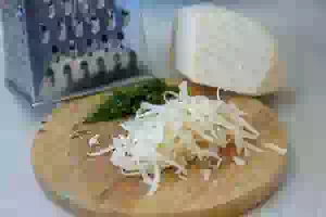 1. Приготовить начинку для котлет: сыр натереть на крупной терке и смешать с мелко нарезанной зеленью. Зелень выбирайте по своему вкусу. Мне, например, больше нравится укроп.