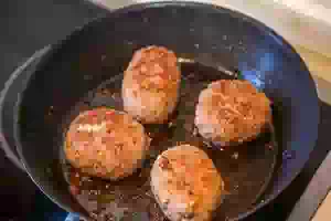 7. В сковороде разогреть немного растительного масла и обжарить на нем котлеты с сырной начинкой до готовности. По желанию, котлеты можно приготовить в духовке. Для этого их надо только слегка обжарить на сковороде, а затем переложить на противень, застеленный пекарской бумагой. За 20 минут довести котлеты до полной готовности в предварительно прогретой до 180С духовке. Готовые котлеты из баранины с сырной начинкой подавать горячими с рисом и свежими овощами.