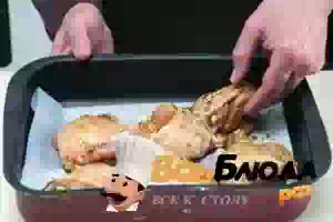 3. Достаем бедра из маринада, выкладываем в форму для запекания, застеленную пергаментной бумагой.