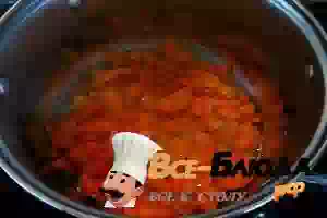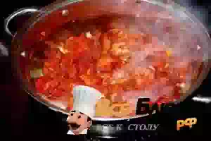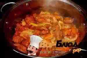 8. Мясо слегка обжарилось, доливаем в кастрюлю примерно стакан воды и добавляем нарезанный полосками или кубиками болгарский перец и измельченный чеснок, добавляем соль. Уменьшаем огонь под кастрюлей, накрываем ее крышкой и тушим примерно 1 час. Следим за уровнем воды, если будет необходимость - можно долить.