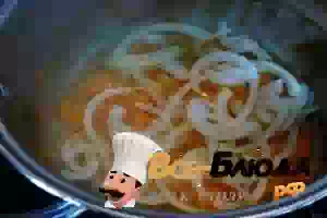 5. Чистим репчатый лук и нарезаем полу-кольцами. Добавляем его к моркови и, помешивая, обжариваем до прозрачности лука.