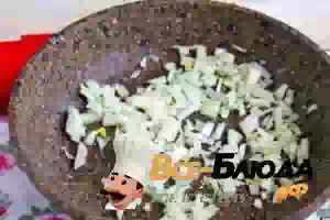 1. Лук мелко режем, обжариваем на растительном масле до золотистого цвета.