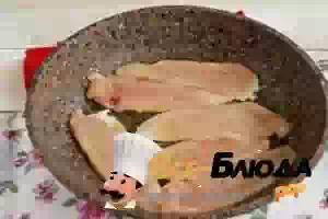 2. Куриную грудку разрезаем вдоль на тонкие пластики. Выкладываем на разогретую сковороду с маслом и обжариваем на сильном огне буквально по 3 минуты с каждой стороны, солим и перчим.