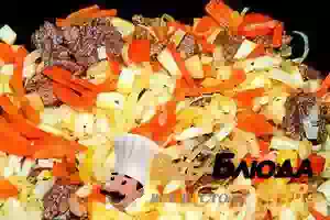 7. Перемешать, долить овощным бульоном или горячей водой, накрыть крышкой и оставить тушиться на очень слабом нагреве на два часа. За полчаса до окончания тушения рагу посолить. Подавать с любым гарниром или без оного.