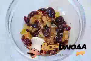 1. Перед замесом теста подготовить сухофрукты. Для этого промыть изюм и вяленую клюкву, сложить в миску и залить ромом или другим алкоголем. Оставить на 2 часа.