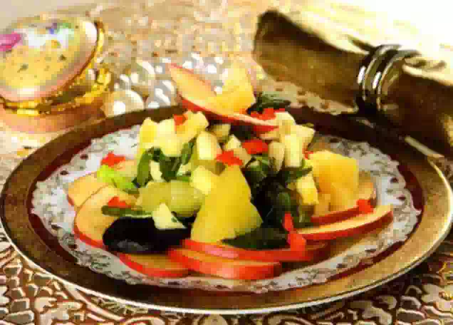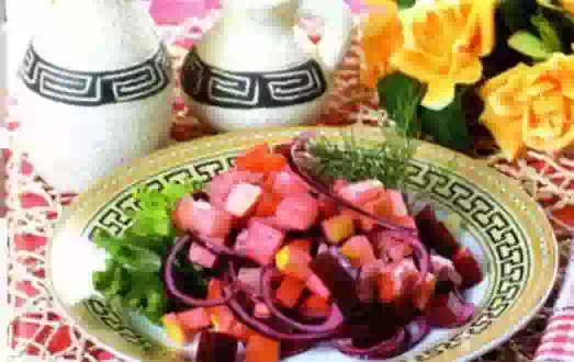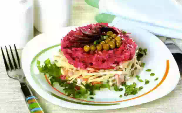 Салат овощной с яблоками необходимые продукты для приготовления салата 1 небольшая морковь 1/2 стакана консервированного зеленого горошка 300 г белокочанной капусты 1 яблоко 2 вареные картофелины 2-3 яйца 1 вареная свекла 2 дольки чеснока майонез