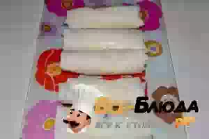 3. Налейте теплую воду в подходящую посуду, по размеру совпадающую с рисовыми листами, и опустите в нее лист на несколько секунд для размягчения. Переложите размякший рисовый лист на хлопковое полотенце.