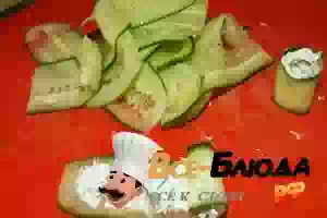 3. Половину огурца нарезать лентами при помощи овощечистки. На каждую ленту выложить мягкий сыр, смешанный с зеленью, размазать и скрутить в ролл. Я приготовила 12 роллов, но можно и больше, они интересно смотрятся в салате и нежные на вкус!