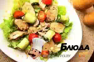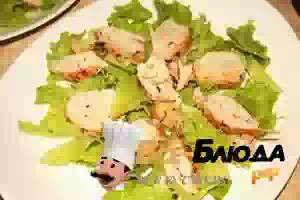5. Промытые и подсушенные салатные листьями порвать руками на кусочки и выложить на тарелку. Сверху разложить куриное филе.