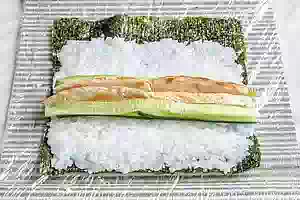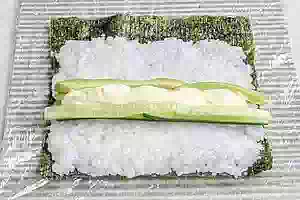 13. Выкладываем посередине риса полосу мягкого сыра.