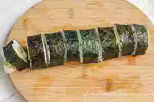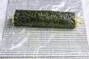 16. Помогая ковриком, скручиваем плотный рулет. Нетронутый край нори слегка смачиваем водой и фиксируем.
