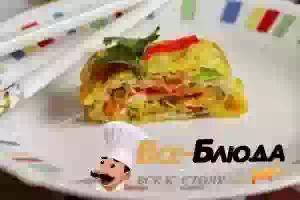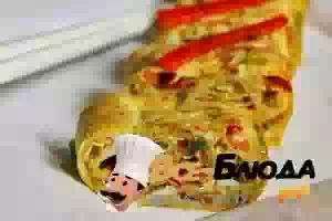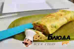 4. Вылейте примерно половину яичной смеси на сковороду, обжарьте её пару минут до полуготовности. Аккуратно с помощью лопатки начните заворачивать в рулет.