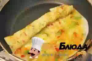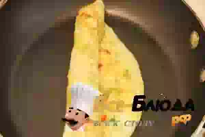 5. На свободный край сковороду налейте примерно половину оставшейся яичной смеси. Жарьте еще пару минут, после снова сверните и повторите процесс еще раз.