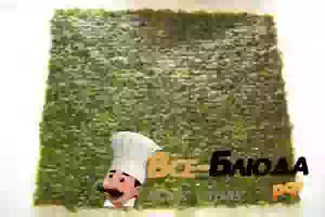 1. Отварить рис для суши. Для этого в кипящую воду добавить соль и сахар по вкусу. Варить рис до полного выкипания жидкости. Готовый рис должен иметь клейкую структуру, иначе роллы развалятся. Положить лист нории блестящей стороной вниз.