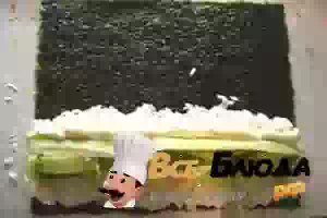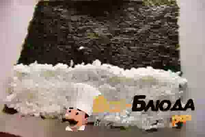 2. Взять небольшую горстку охлажденного вареного риса и равномерно распределить его на половине листа нории толщиной 5 мм.