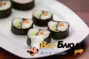 4. Положить получившиеся валики один на другой, чтобы свободные концы нори смотрели в противоположные стороны. Завернуть (точнее подвернуть) свободные края, чтобы получился один довольно толстый ролл. Получившийся ролл немного покатать, обернув в коврик, чтоб суши получились более плотными. Обмакнуть нож в уксусную воду и нарезать суши толщина около 1-1.5 см. Разложить на тарелку, подавать с соевым соусом, васаби и маринованным имбирем.