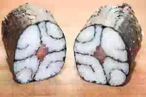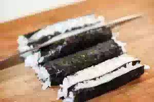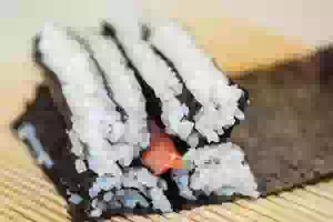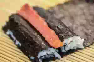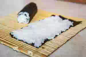 1. Приготовить рис для суши по базовому рецепту. Каждый лист нори разрезать пополам и положить на макису (бамбуковый коврик). Отступить от верхнего края нори примерно 1 см и равномерно распределить по поверхности листа теплый рис. Скрутить с помощью коврика 2 валика.
