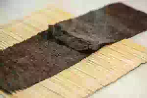 3. Разрезать пополам второй лист нори, соединить половинки в длину, смочив место соединения водой. Получится вот такой длинный лист нори.