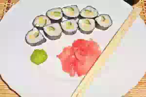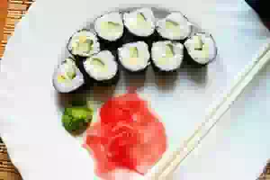 14. Подавать роллы с соевым соусом, васаби и розовым имбирем. Кушать желательно сразу после приготовления, так как нори смягчает рис, и роллы утрачивают свои полезные свойства.