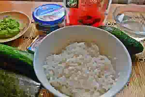 1. Хорошо промыть рис. Промывать до тех пор, пока вода не станет прозрачной. Залить рис водой (холодной!). Рис для суши варится исходя из пропорции 1 стакан риса на каждые 1,5 стакана воды. Поставить кастрюлю на огонь и накрыть крышкой. Довести до кипения. Уменьшить огонь и варить 10 минут. Спустя время включить большой огонь примерно на 10 секунд и снять с огня и отставить на 5 минут.