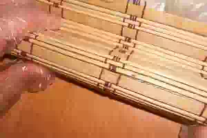 12. Чтобы завернуть ролл, необходимо взять верхний край циновки и завернуть. Немного отодвинуть роллы от себя, и опять завернуть. Можно просто завернуть бамбуковый коврик с другой стороны, кому как удобнее. Старайтесь хорошо придерживать начинку и плотно заворачивать.
