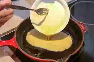Подготовить продукты для начинки роллов. Разрезать пополам вдоль огурцы, а затем каждую половинку нарезать полосками. Удалить семена, чтобы они не дали лишнюю влагу в готовых роллах. Яйца валить в небольшую миску, размешать вилкой, немного посолить и вылить на сковороду. Пожарить 1 большой или несколько маленьких яичных блинчиков. Затем переложить их на тарелку дать немного остыть.