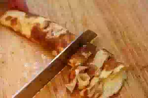 10. Обмакнуть нож в уксусную воду и нарезать роллы на небольшие отрезки. Корейские роллы с тунцом, яичным блином и корейской морковкой готовы. Можно подавать их на стол с соусом или бульоном по вкусу.