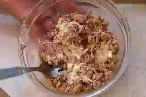 4. С банки консервированного тунца слить масло и размять вилкой. Будет вкуснее, если к этой массе добавить майонез.