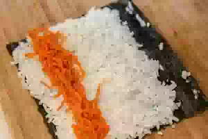 5. Лист нори положить на бамбуковый коврик блестящей стороной вниз. На нори тонким слоем распределить рис, оставив свободным верхний край примерно на 3 см. Чтобы рис не лип к рукам, смочите ладони уксусной водой. Отступив от нижнего края листа нори примерно 3-4 см, уложить поперек слой корейской морковки. Кладите морковь, не жалея, тогда роллы получатся сочными.
