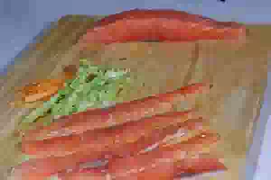 1. Рис для суши промывать в холодной воде, пока вода не станет почти прозрачной. Переложить в дуршлаг, оставить на 40 минут. Залить рис холодной водой, накрыть крышкой. Поставить кастрюлю на средний огонь (примерно 6-7), дождаться, когда вода закипит, после чего увеличить нагрев до максимума и варить 3 минуты, не снимая крышку. После уменьшить огонь (до 3-2) и продолжать варить под крышкой еще 5 минут. Вода не должна кипеть! Через пять минут, снять кастрюлю с плиты, убрать крышку, накрыть полотенцем и закрыть крышкой. Оставить на 15 минут. Для соуса смешать все ингредиенты и довести до кипения, чтобы кристаллы сахара и соли растворились. Если нет конбу, то обходимся без водорослей, либо добавляем листик нори. Когда соус будет готов, процедите его. Готовый рис переложить в миску, полить соусом и ‘порубить’ плоской деревянной ложкой. Рис готов. Рыбу нарезать тонкими полосками шириной 1 см и длиной 4-5 см. Морковь нарезать тонкой соломкой, лист салата - полосками шириной 5 мм.