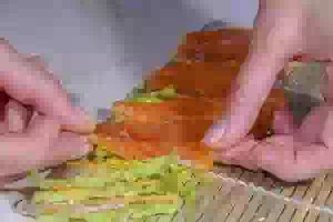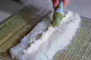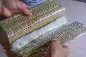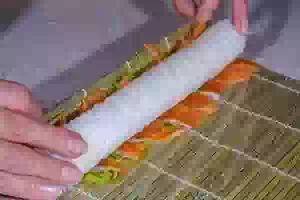 3. Сложить бамбуковый коврик пополам, стараясь сжать рис так, чтобы получился ровный красивый валик диаметром 1.5 см, в центре которого будет начинка из сыра и васаби. Отложит рисовый валик в сторону.