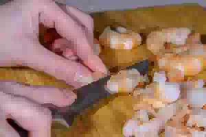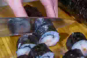 6. Обмакнуть нож в уксусную воду и нарезать маки суши (толщина около 1-1.5 см).