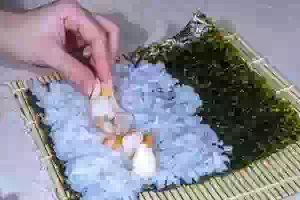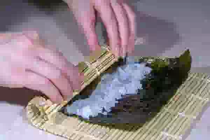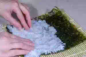 2. На бамбуковый коврик для суши положить лист нори. На нори тонким слоем распределить рис, оставив свободным верхний край нори (примерно 3 см). Чтобы рис не лип к рукам, смочите их в уксусной воде.