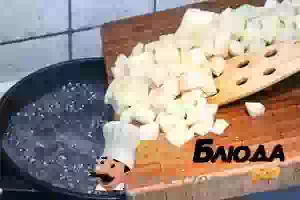 3. Картофель очистить, нарезать кубиками и положить в кипящую подсоленную воду.