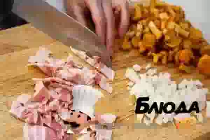 1. Лисички промыть, откинуть на дуршлаг, чтобы стекла вода. Бекон и репчатый лук мелко порезать. Цветную капусту разобрать на соцветия.
