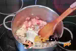 2. В кастрюле разогреть немного растительного масла и добавить бекон. Обжаривать, помешивая, пока бекон не зарумянится. После этого положить в кастрюлю лук и пассеровать до мягкости.