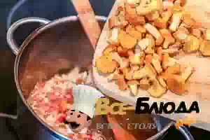 3. Мелкие лисички оставить целыми, крупные порезать пополам или на четвертинки. Переложить грибы в кастрюлю с беконом и луком, обжаривать, пока не выпарится излишек жидкости из грибов. Посолить и поперчить по вкусу. Влить примерно стакан воды и проварить на среднем огне примерно 10 минут.