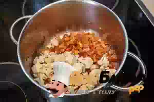 4. Добавить в суп цветную капусту и залить горячей водой из чайника. Варить суп на среднем огне примерно 10 минут после закипания. Готовый грибной суп из лисичек с цветной капустой и беконом разлить по тарелкам и подавать горячим, можно со сметаной и свежей зеленью.