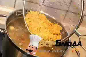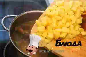 4. В получившийся грибной суп положить нарезанный кубиками картофель. Как только суп закипит, уменьшить нагрев и варить до готовности картофеля.