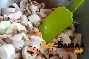 3. В сковороде разогреть кусочек сливочного масла, добавить грибы вместе с луком и морковью. Обжаривать все вместе в масле не менее 10 минут, постоянно помешивая, чтобы овощи и грибы не подгорели.
