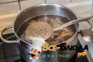 5. Грибы залить водой из чайника, поставить кастрюлю на огонь, и как только вода закипит, уменьшить нагрев до среднего и варить, снимая шумовкой образующуюся пену примерно 20 минут. Посолить по вкусу.