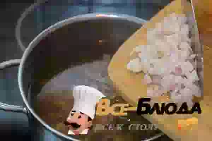 6. Добавить в грибной бульон репчатый лук. Вместо него можно взять молодой зеленый. Или сначала пассеровать репчатый лук на масле и после этого отправить в кастрюлю с грибами.