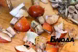 2. Грибные шляпки разрезать на четыре-шесть частей, ножки - поперек на кружочки. На срезе подосиновики синеют, так и должно быть.